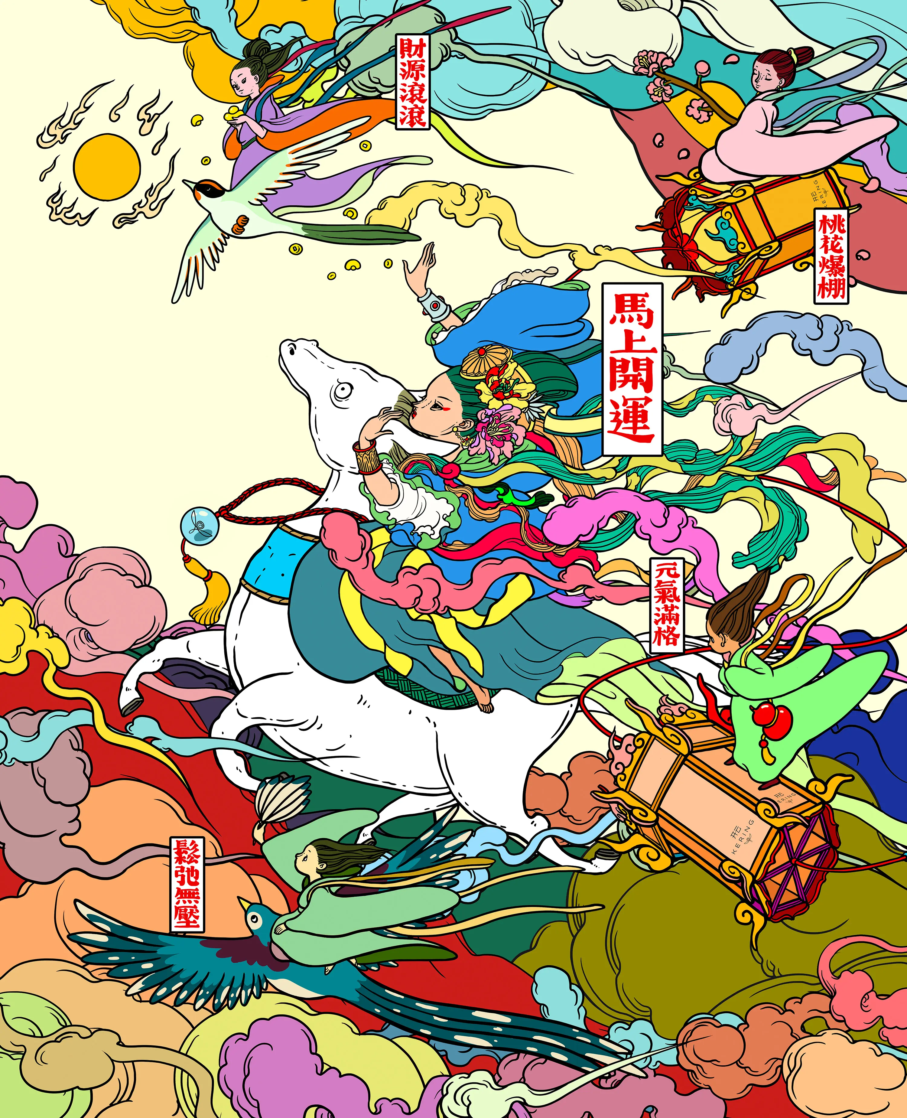 Dans Clouds Burst Apart, Fortune Gallops In, Wen Na a imaginé une scène animée par le mouvement et la lumière. Composée de touches de pinceau aériennes et expressives aux couleurs éclatantes, l’œuvre est débordante de vie : les nuages s’écartent pour révéler le soleil, un noble destrier s’élance à pleine vitesse, des hirondelles fendent le ciel, tandis que des lanternes zouma ponctuent l’horizon. Des motifs de bon augure (lingots d’or, fleurs de pêcher, calebasses et éventails en plumes) parsèment la composition, véhiculant des vœux de prospérité, de vitalité et de bonne fortune.