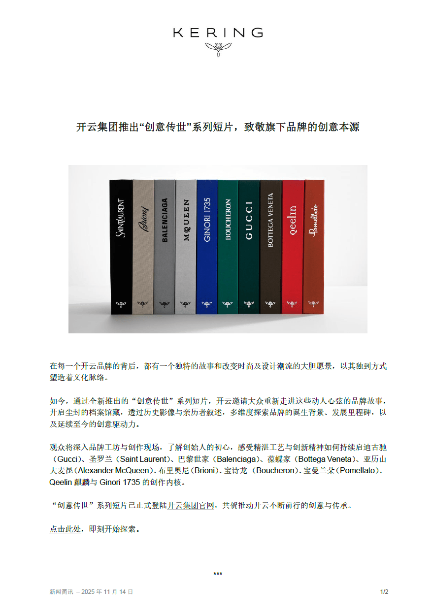 “创意传世”系列短片已正式登陆开云集团官网,共贺推动开云不断前行的创意与传承。
