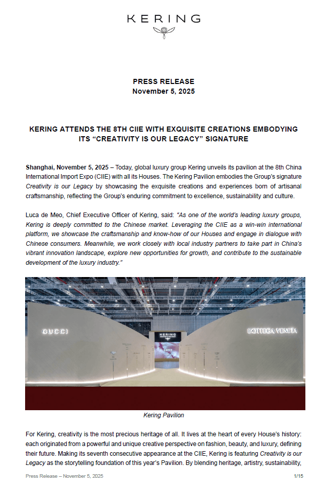 Luca de Meo, Chief Executive Officer of Kering, said: “As one of the world’s leading luxury groups, Kering is deeply committed to the Chinese market. Leveraging the CIIE as a win-win international platform, we showcase the craftsmanship and know-how of our Houses and engage in dialogue with Chinese consumers. Meanwhile, we work closely with local industry partners to take part in China’s vibrant innovation landscape, explore new opportunities for growth, and contribute to the sustainable development of the luxury industry.”