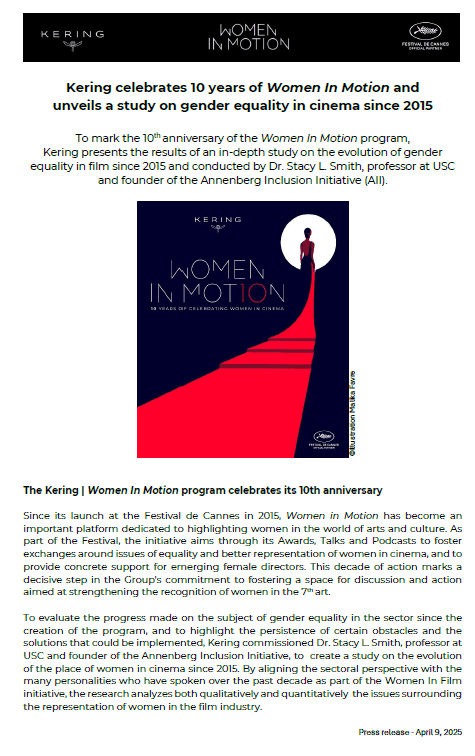 Kering presents the results of an in-depth study on the evolution of gender equality in film since 2015 and conducted by Dr. Stacy L. Smith, professor at USC and founder of the Annenberg Inclusion Initiative (AII).