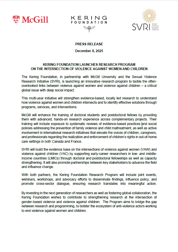 The Kering Foundation, in partnership with McGill University and the Sexual Violence Research Initiative (SVRI), is launching an innovative research program to tackle the often-overlooked links between violence against women and violence against children – a critical global issue with deep social impact.