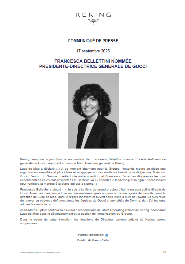 Kering annonce aujourd’hui la nomination de Francesca Bellettini comme Présidente-Directrice générale de Gucci, reportant à Luca de Meo, Directeur général de Kering.