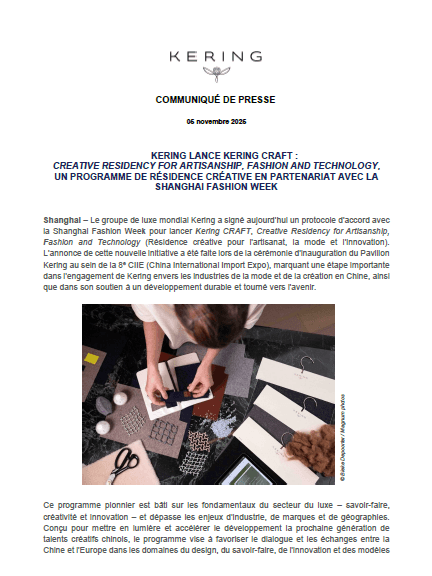 Le groupe de luxe mondial Kering a signé aujourd’hui un protocole d'accord avec la Shanghai Fashion Week pour lancer Kering CRAFT, Creative Residency for Artisanship, Fashion and Technology (Résidence créative pour l'artisanat, la mode et l’innovation). L'annonce de cette nouvelle initiative a été faite lors de la cérémonie d'inauguration du Pavillon Kering au sein de la 8e CIIE (China International Import Expo), marquant une étape importante dans l'engagement de Kering envers les secteurs de la mode et de la création en Chine, ainsi que dans son soutien à un développement durable et tourné vers l'avenir.