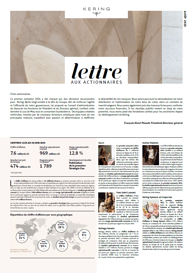 La Lettre aux actionnaires de Kering est publiée deux fois par an. Elle a pour but de revenir sur les résultats financiers du Groupe et de présenter les différentes actualités des marques. Ce document est envoyé par courrier à toutes les personnes qui en font la demande à actionnaire@kering.com ou au +33 (0)1 45 64 65 64.