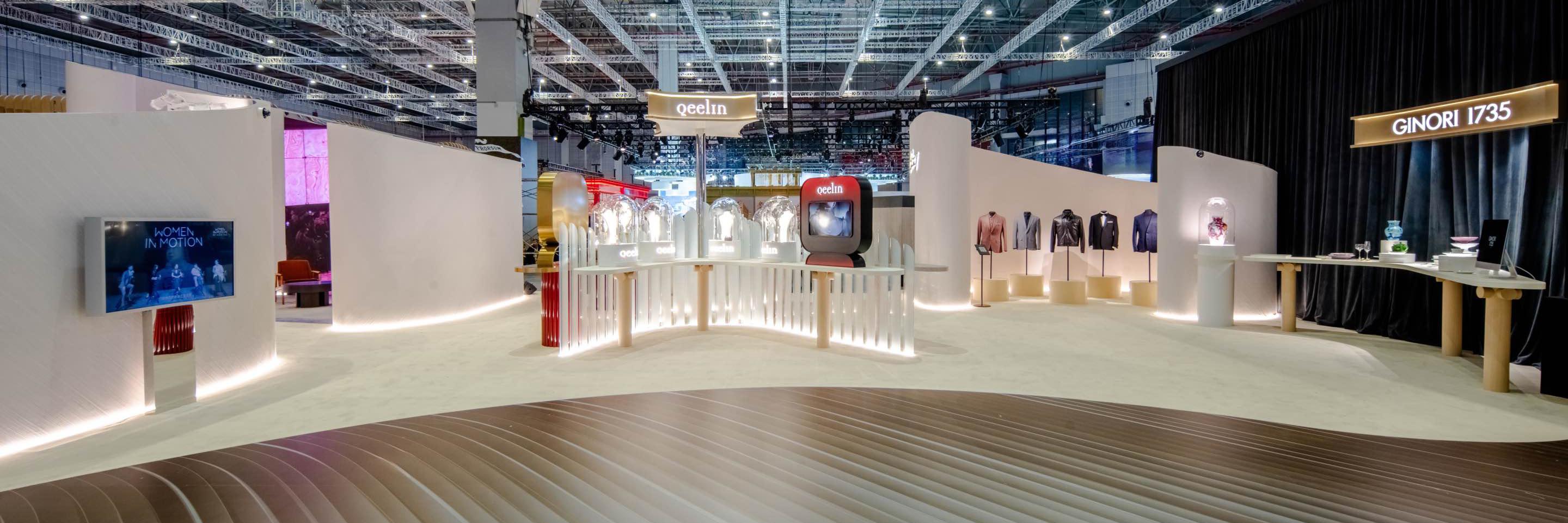 Des formes fluides où nait un équilibre délicat entre ouverture et confidentialité : puisant son inspiration dans la nature, le Pavillon Kering reflète l'énergie créative et le dynamisme du Groupe. Au sein d'espaces délimités par des cloisons incurvées, chaque Maison révèle son univers distinctif et son savoir-faire unique. Les tables de présentation, soulignées par des panneaux courbes, invitent à l’exploration. Traversant les panneaux, la lumière projette des ombres mouvantes qui donnent vie et profondeur aux créations présentées au public.