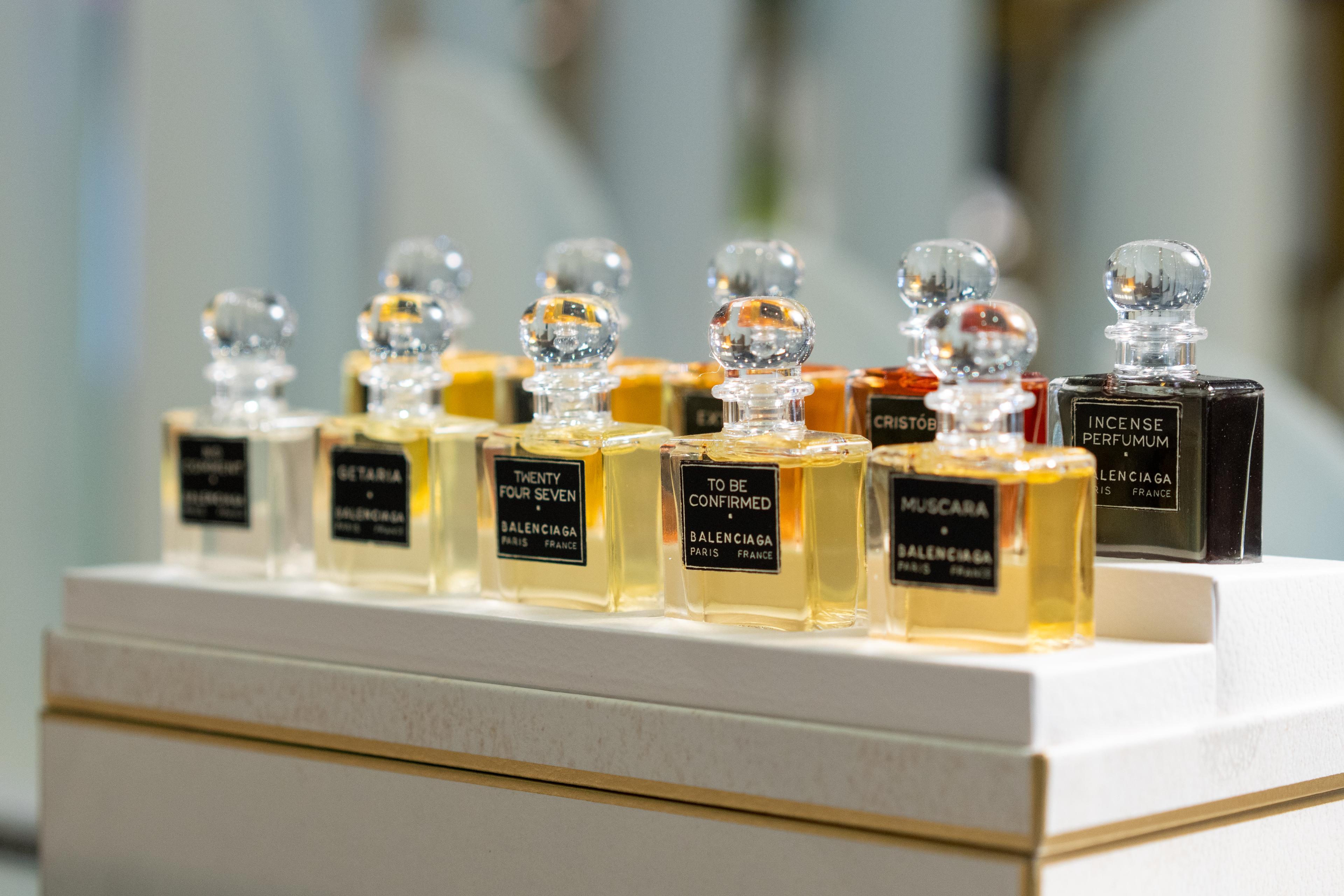 Plus loin, les dix parfums de la nouvelle collection de haute parfumerie de Balenciaga, lancée en septembre 2025, reposent sur une surface en béton brut et texturé. C’est la première fois qu’ils sont présentés en Asie-Pacifique.