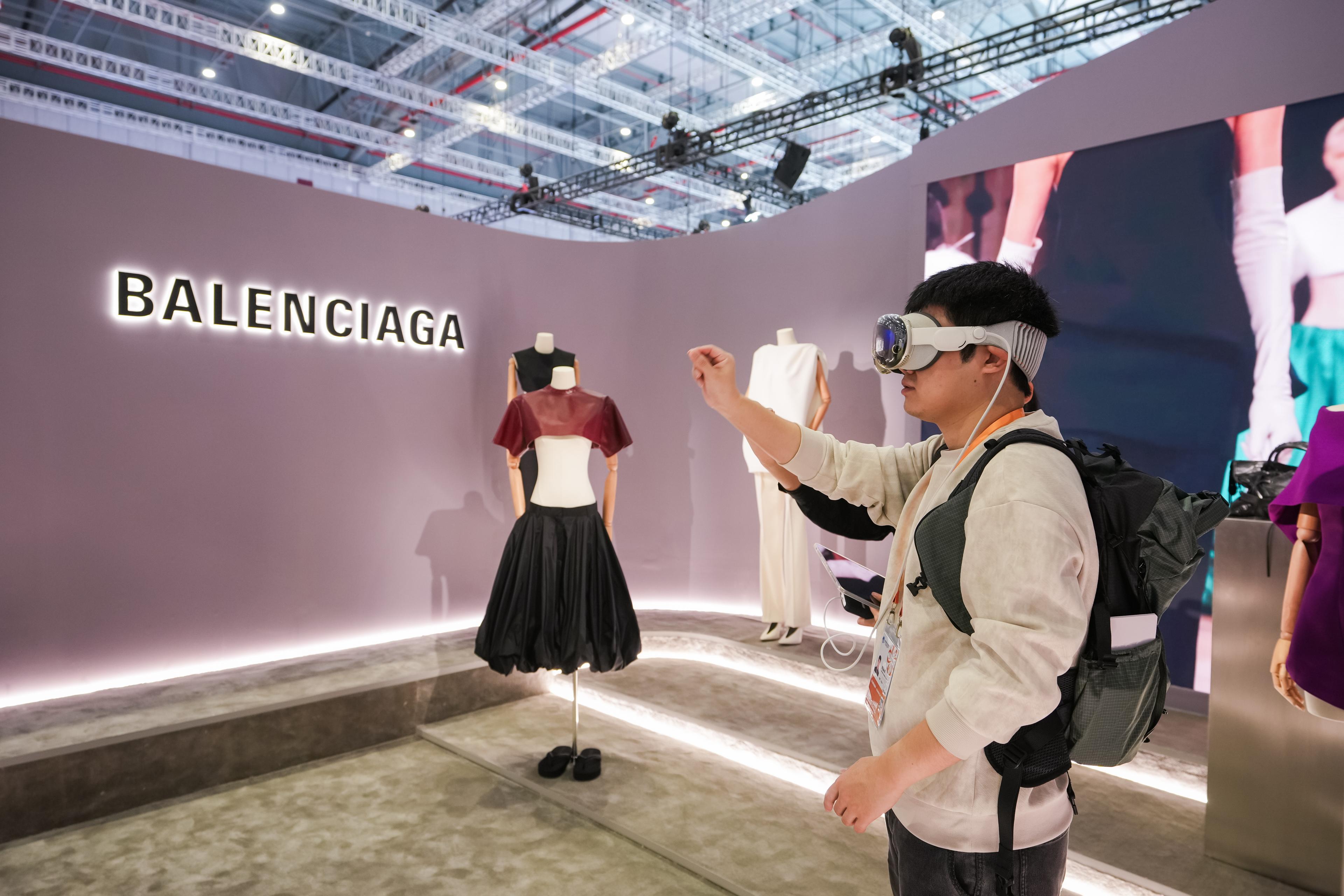 À quelques pas, Balenciaga présente cinq looks du défilé Printemps/Été 2026, la première collection de Pierpaolo Piccioli pour la Maison. Un casque Apple Vision Pro permet aux visiteurs de revivre le défilé en réalité virtuelle, depuis le premier rang.