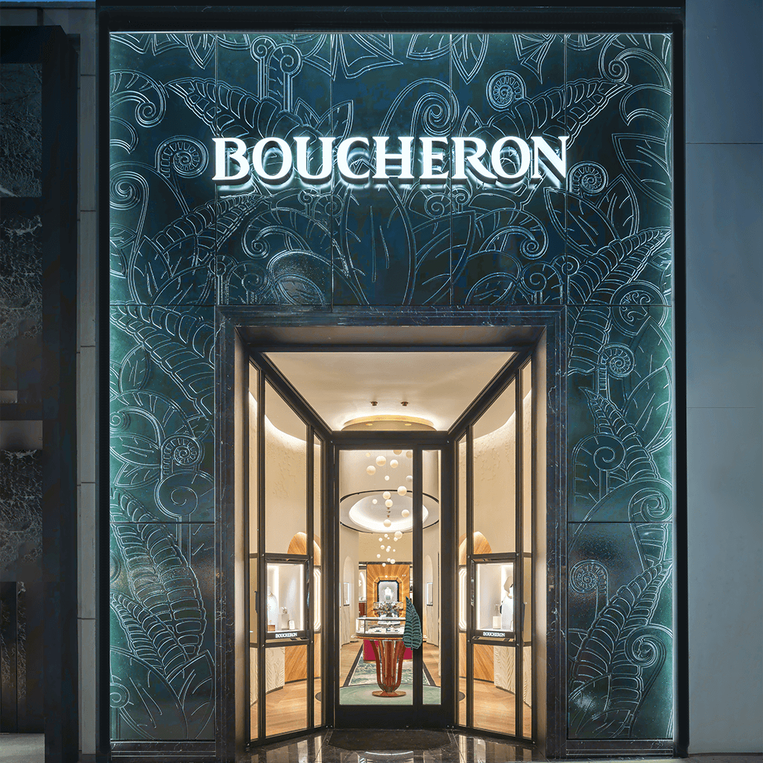 La boutique de Los Angeles, sur Rodeo Drive, inaugurée en juin 2025, marque un autre temps fort dans la stratégie de Boucheron. Comme un retour aux sources, son décor d’inspiration Art déco évoque le cinéma hollywoodien et ses icônes. La façade en roche volcanique verte, conçue spécialement pour cet emplacement dans la couleur signature de Boucheron, se démarque nettement des boutiques voisines, apportant une touche de luxe à la française en Californie.