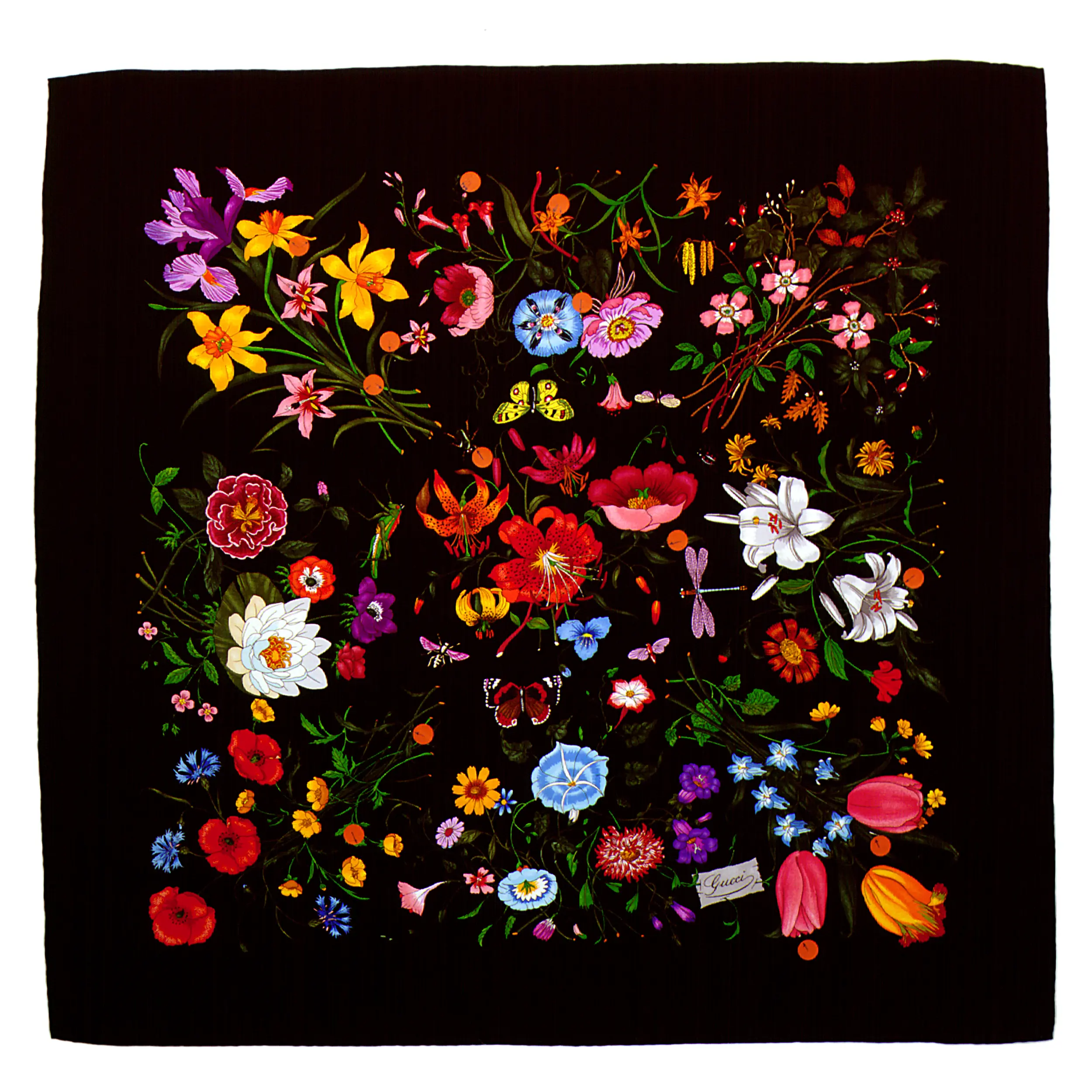 I 27 fiori del foulard Flora appartengono infatti a specie presenti nel territorio, radicando il motivo nel legame con Firenze: rose, peonie, papaveri, iris, tulipani e anemoni sono disposti in una composizione libera, non ripetitiva, che conferisce al disegno una ricchezza pittorica di gusto quasi rinascimentale. Nel tempo il motivo è rimasto pressoché invariato, fatta eccezione per il colore di fondo. Oggi l’Archivio Gucci di Firenze conserva oltre 300 foulard Flora, testimonianza delle numerose reinterpretazioni del motivo.