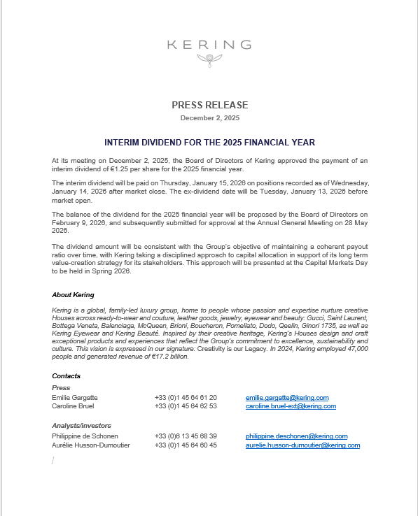At its meeting on December 2, 2025, the Board of Directors of Kering approved the payment of an interim dividend of €1.25 per share for the 2025 financial year.