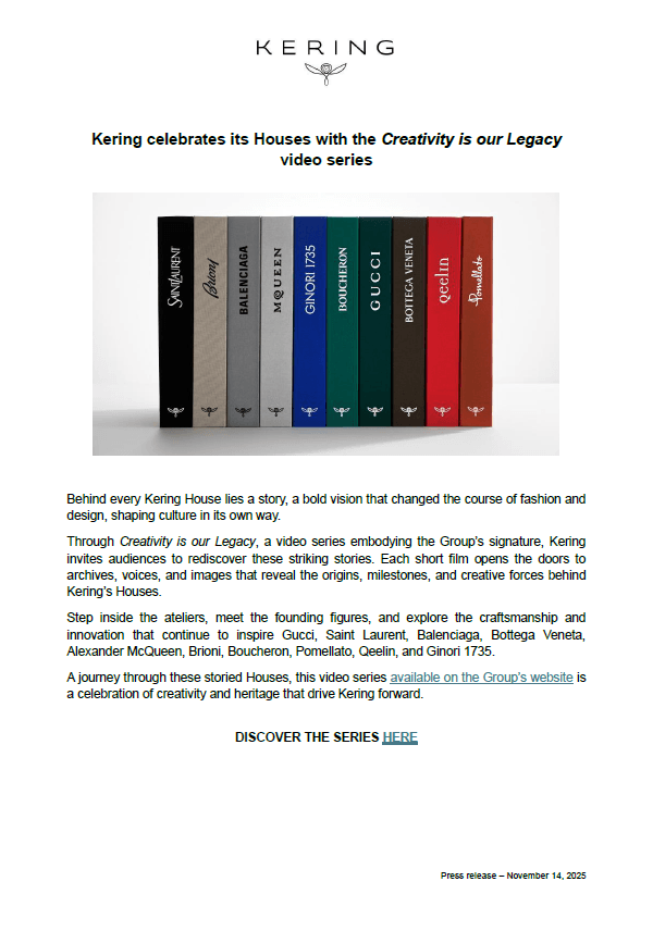 Through Creativity is our Legacy, a video series embodying the Group’s signature, Kering invites audiences to rediscover these striking stories. Each short film opens the doors to archives, voices, and images that reveal the origins, milestones, and creative forces behind Kering’s Houses.