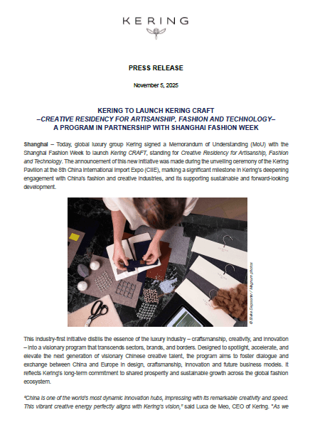 Today, global luxury group Kering signed a Memorandum of Understanding (MoU) with the Shanghai Fashion Week to launch Kering CRAFT, standing for Creative Residency for Artisanship, Fashion and Technology. The announcement of this new initiative was made during the unveiling ceremony of the Kering Pavilion at the 8th China International Import Expo (CIIE), marking a significant milestone in Kering’s deepening engagement with China's fashion and creative industries, and its supporting sustainable and forward-looking development.