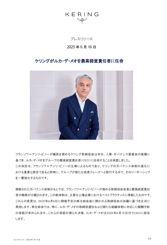 刷新されたガバナンス体制のもとでは、フランソワ=アンリ・ピノーが務める取締役会会長と最高経営責任者の職務が分離されます。この新体制は、主要な上場企業におけるベストプラクティスに準拠したものです。これらの変更は、2025年9月9日に開催予定の株主総会後に開かれる取締役会の決議に基づき正式に発効します。株主総会では、特に、ルカ・デ・メオの取締役選任および新たな組織体制に対応した報酬方針の承認が求められます。これらの承認が得られ次第、ルカ・デ・メオは2025年9月15日付でCEOに就任します。